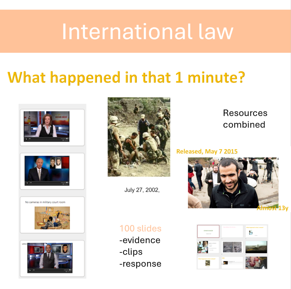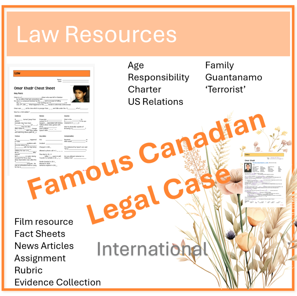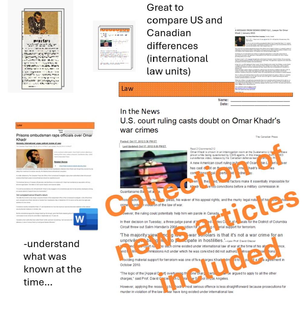 The Omar Khadr case is one of the most memorable legal cases for students and helps teach international law. It explores differences in media interpretation and legal processes. Our relationship with the United States, young offender exceptions, and the inclusion of family responsibility are great discussion points for determining criminal responsibility. This collection follows the reveal of evidence so that the students can inform themselves and consider the complexity of legal cases.