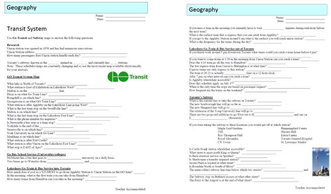 Help students become more familiar with the Go train system, Stations, and subway stops. If you don’t live in Toronto or are new to the city it takes time to figure out the stops and schedules. This activity is meant to help the students become more familiar with names that they will hear on CP24, the news, or read about in the newspapers.