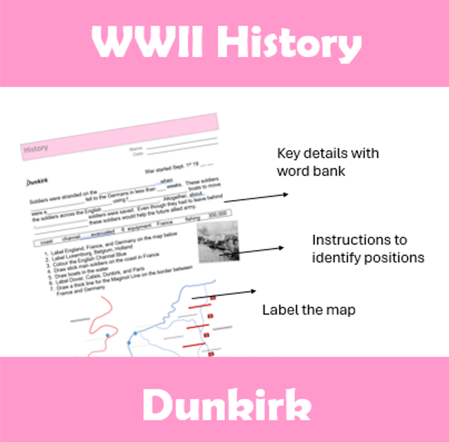 This worksheet not only has the key details for Dunkirk but also has a map to help the students understand the significance of the battle. It highlights the location of the English Channel as well as the German and French position. It includes a word bank and helps the students to remember this battle. If you add a few clips from the movie then you have a great lesson!