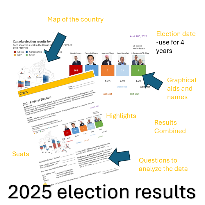Colour the map to help students understand the recent 2025 Canadian government election results. I have used these map activities for many years in the classroom to help students understand voting patterns. The geographic differences help to understand the political differences