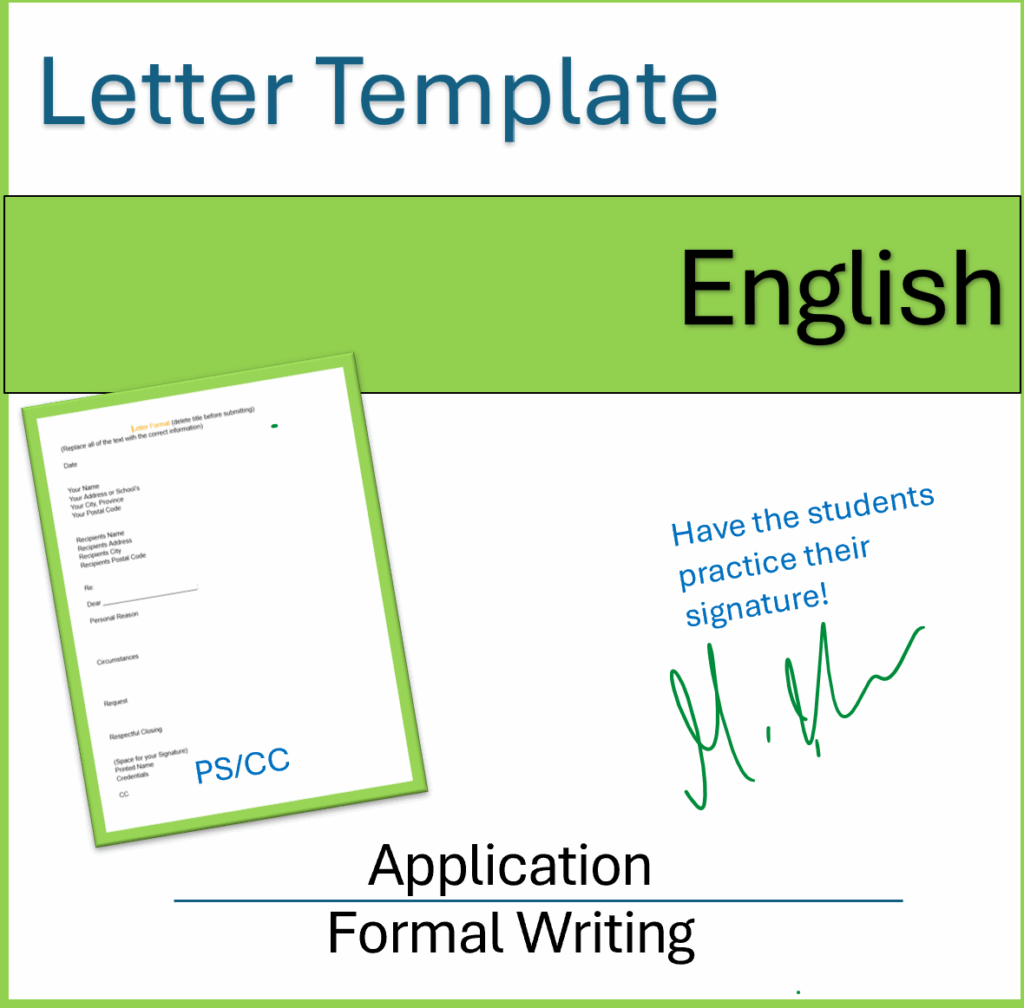 Teach the students how to write a formal letter with all the parts by replacing the details with the school address and a local politicians. This also allows you to teach how to sign a document and print their name. The date and credentials helps to make it professional. The template can be used for personal as well as business and once students have a copy save then they can use it again and again and just change a few details. I have found that students have a hard time getting started and this helps them to get started.