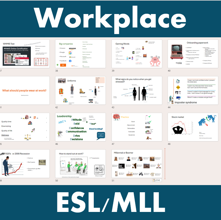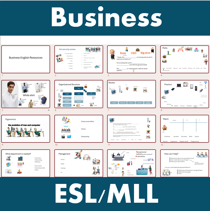This package helps tutors with free talk or adult students who want to learn business English. It is helpful to explain concepts, terms, and buzzwords. It has word prompts, examples, and some activities to help students practice.